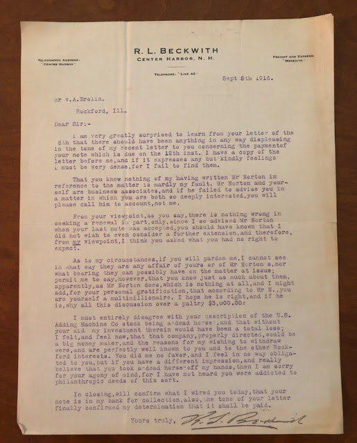 I recently purchased a large lot of letterheads and other paper ephemera from an online auction was from a Rockford Illinois family. That family was the Brolins. The patriarch was Willard A. Brolin Sr. He had is hand in numerous Rockford businesses and was a millionaire before the 1929 stock market crash in which he lost everything. Amongst that lot of papers was a rather benign looking letterhead for an R.L. Beckwith of Center Harbor New Hampshire. The typed letter discusses business. I always do a quick research of the items I sell on ebay just to make sure I am not missing anything. To my surprise, Richard L. Beckwith was a Titanic survivor! There is a market for Titanic survivor signatures and I was fortunate to be able to market this as such. What also helped me to link this to the Beckwith Titanic survivor was other paper in my lot from William Monypeny Newsom - who was Beckwith's stepson. Without that link, I would have had to put a caveat on my listing as a "possible" survivor, but with that paper, I was able to be sure this was the correct Beckwith.